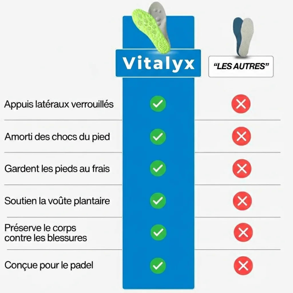 Dites adieu aux douleurs aux pieds et aux articulations ! Conçues spécifiquement pour les joueurs de padel, les nouvelles Semelles Vitalyx décuplent votre vitalité et performance sur le court.